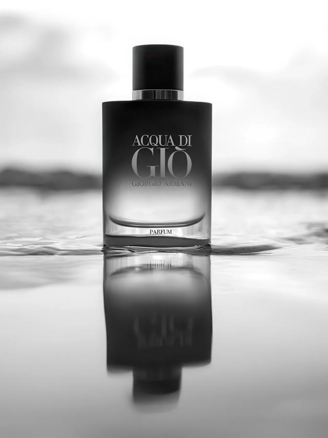 El degradado negro del frasco evoca las rocas volcánicas de Pantelleria, isla italiana que inspira a Giorgio Armani, añadiendo un toque misterioso y masculino. La marca en el frente es minimalista, con texto blanco para "Acqua di Giò" y negro para "Parfum" y "Giorgio Armani", junto al logotipo GA en la tapa y atomizador, reforzando una estética preciosa y duradera.