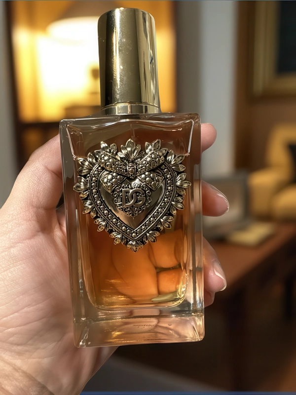 El frasco encarna la estética lujosa de Dolce & Gabbana mediante un diseño que fusiona elegancia italiana con simbolismo universal. Su elemento distintivo es el Sagrado Corazón, motivo metálico que corona el frasco y conecta directamente con la línea de bolsos Devotion de la marca.