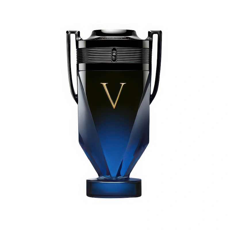 Esta actualización representa un cambio estratégico en la identidad visual de Rabanne. El frasco mantiene su esencia de trofeo, pero evoluciona hacia una forma más vertical y "diamante", fabricado en vidrio con un degradado que va del negro al azul intenso, creando un acabado brillante que evoca misterio y elegancia premium. Su base sólida y líneas más angulares refuerzan una estética contemporánea y sofisticada.