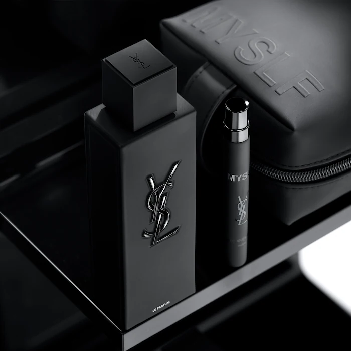 MYSLF Le Parfum está disponible en múltiples formatos: 10 ml en spray de viaje, 40 ml, 60 ml, 100 ml y recarga de 150 ml. El empaque exterior mantiene la estética minimalista de la línea, presentando en el frente el nombre de la fragancia, la casa, el tamaño y la concentración, con el logo YSL en la parte superior.